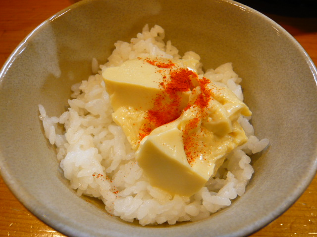 つけ麺を食べ終わる頃に茶碗蒸しののったご飯が提供されます。これに残ったカレーつけだれを掛けて・・・