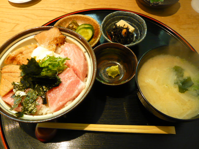 ”大とろどんぶり”には,丼の他に,一品,お味噌汁,お漬物付き。一品やお味噌汁もおいしく,場所柄かご飯の量もボリュームがあり,大満足です。