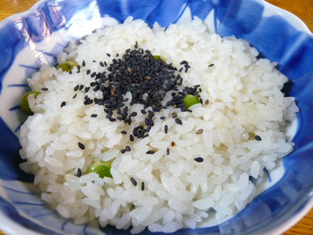 本日のごはんは”豆ごはん”。中華そばの出来上がりまで時間がかかりそうだったので,ごはんを食べつつ待つことに。豆ごはんはおこわ風になっており,もちっと御飯がいい感じ。素朴なところがいいんかな。