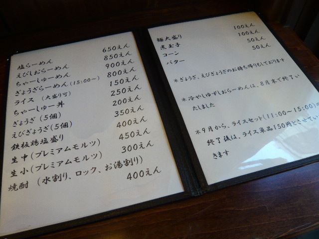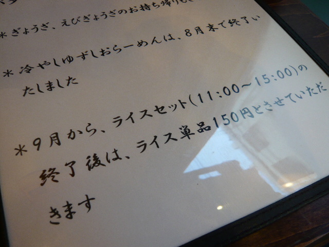 っが,メニューを見ると一新されており,”冷やし・・・は8月末で終了”っと。合わせてライスのサービスもなくなり。