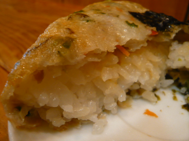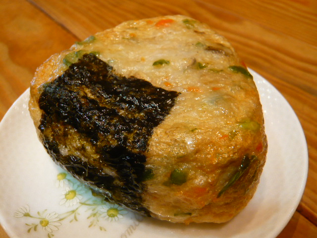 こちらがショーケースを見て気になった一品。その名も”バクダンかまぼこ”。おにぎり型をしたカマボコ。っで,割ってみると中にはご飯。おにぎりにカマボコの生地を付けて揚げたって感じ。揚げたて熱々。