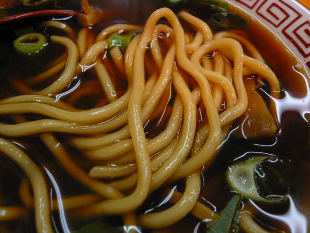 やや酸味のある真っ黒醤油スープに,モチモチ太麺。