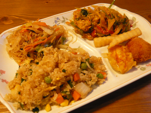 主菜系2品に焼飯・グリーンカレー・サラダ・揚げ物・スープ・デザート。