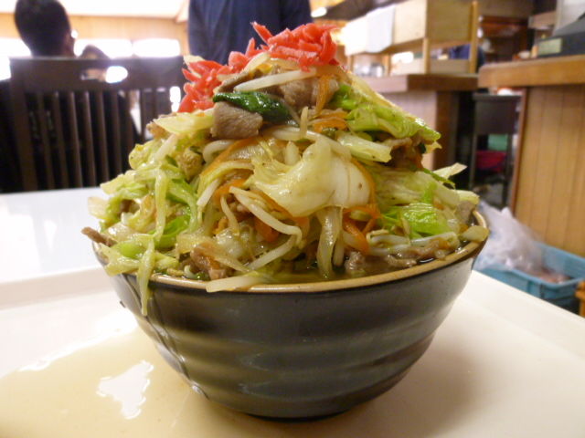丼にテンコ盛りに盛られた肉野菜炒め。