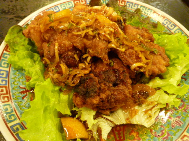大きめな柔らか若鶏唐揚に酸味の効いたレモンソース。