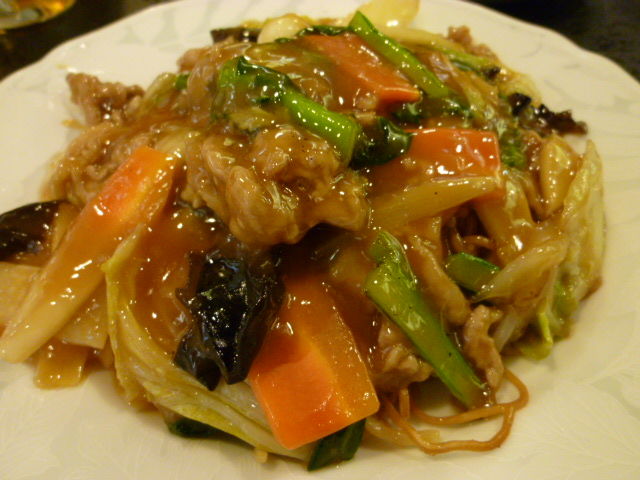 硬めに焼かれた麺の上に,肉野菜たっぷりのトロっとあん。