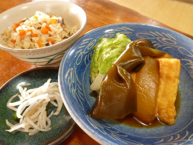 煮付は、厚揚げ・昆布・大根・ジャガイモ・レタス。