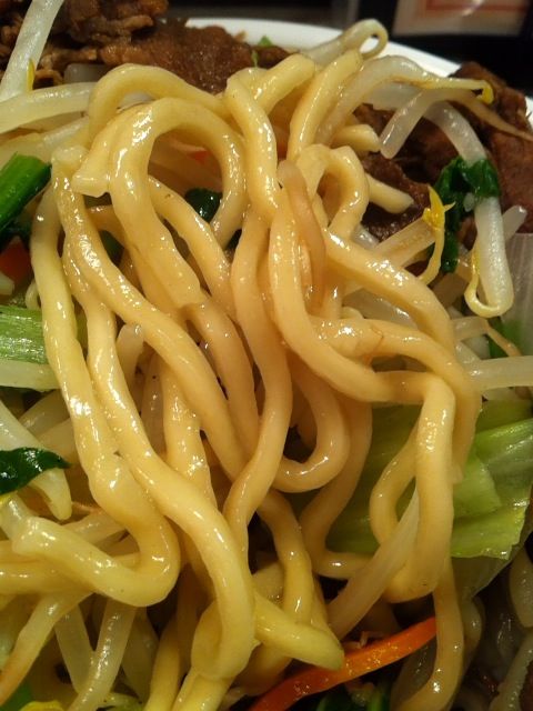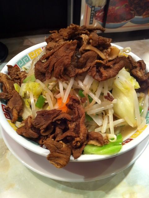 どんぶりに山盛り炒め野菜と甘辛煮っぽい豚肉がどばっと。