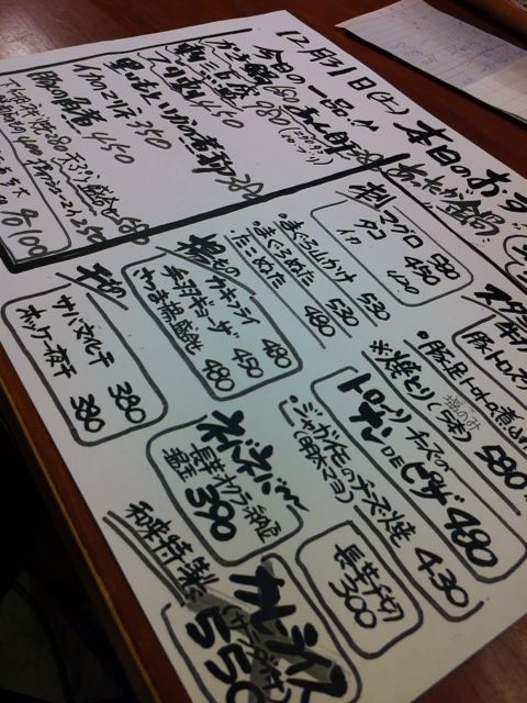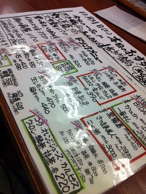 店内はテーブル・座敷のほか、長めのコの字型カウンターがあって、一人客も大丈夫な雰囲気。メニューの一部はこんな感じ。