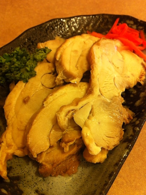 柔らか蒸鶏?煮鶏?に下にはポン酢っぽい味付けの玉葱。