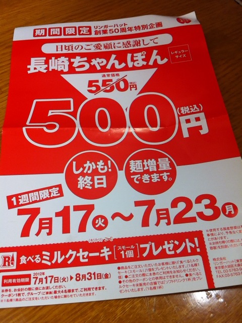 リンガーハット@関内で、長崎ちゃんぽん(麺2倍)。