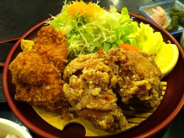 かなり大ぶりな唐揚3個に小ぶりなチキンカツが2枚。