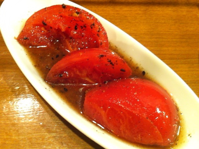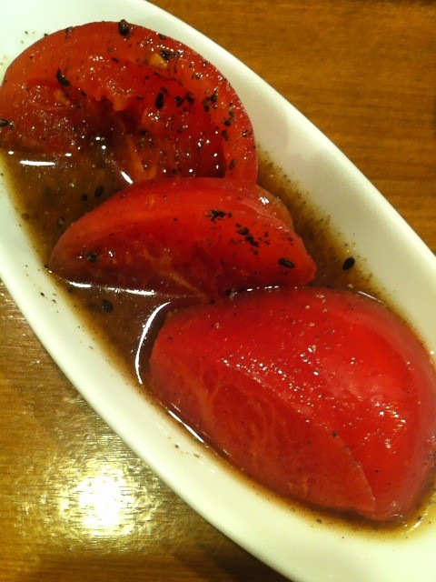 百々@天神(福岡)で、トマトの黒胡麻和え+焼酎各種ほか。