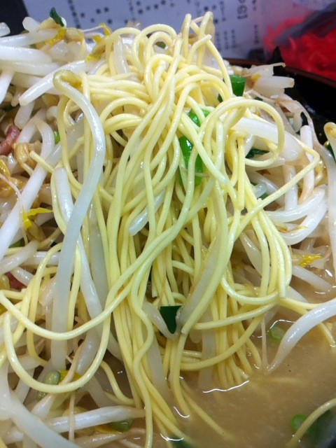 麺は極細ストレート。カタメリクエストのためそこそこ硬め。モヤシの下から掘り出して食べるつもりならばカタメリクエストは不要かも。