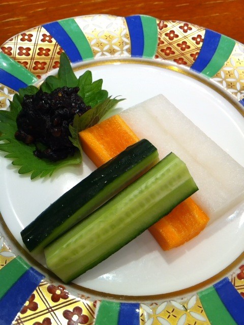 アテに”そば味噌と野菜スティック”。