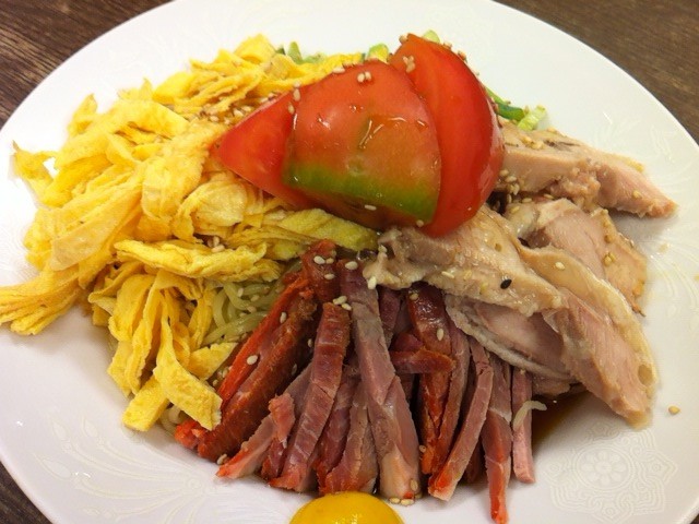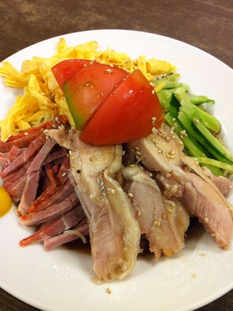 蒸し鶏にハム、玉子、キュウリ、トマトと具だくさん。