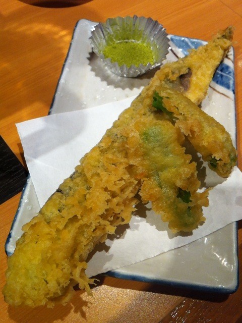 サクっと揚がったサンマ天ぷらにシシトウを抹茶塩で。