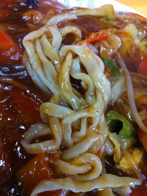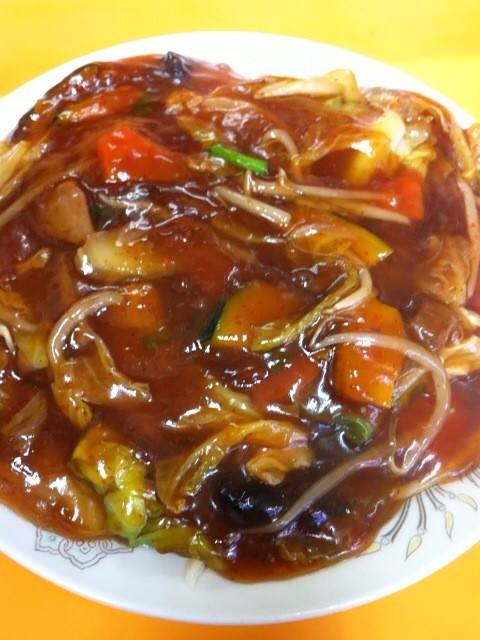 カボチャ、キャベツ、モヤシ、レバーなどが入った甘めでピリ辛なたっぷりあん。