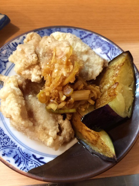 鶏唐揚3個に茄子の素揚げ。そこに油淋鶏風なタレ。