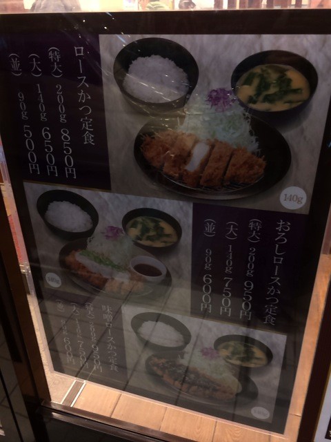 従来のロースカツ定食が10円値上がりし、重量別の3段階に。