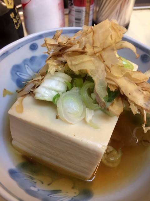 湯豆腐は出汁?で煮込まれた豆腐に削り節とネギ。