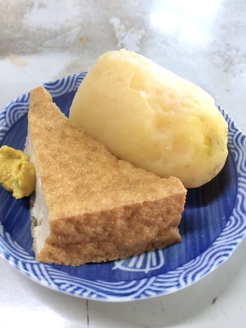 サービスのお通しは厚揚げにジャガイモ。