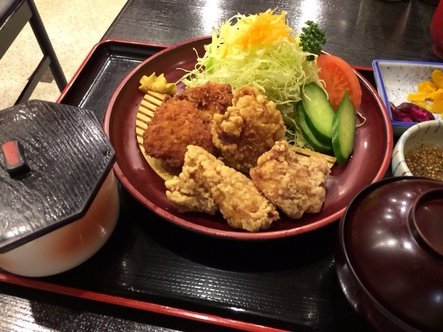 鶏唐揚とチキンカツの盛り合わせの定食。
