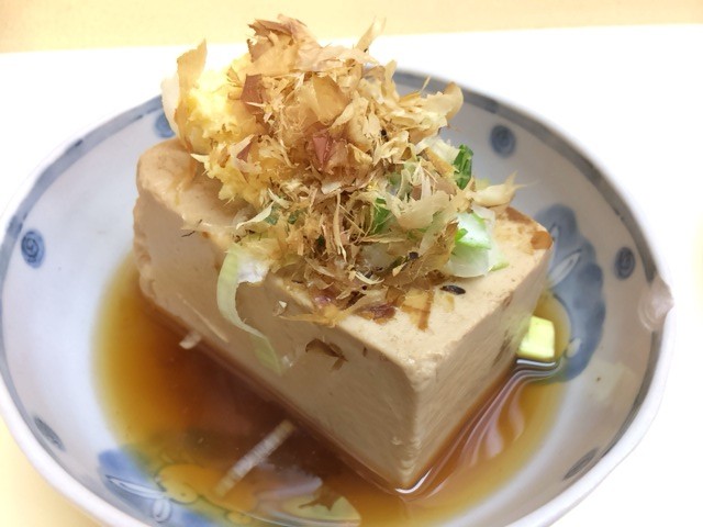 出汁で煮込まれた豆腐にネギ、生姜、鰹節。