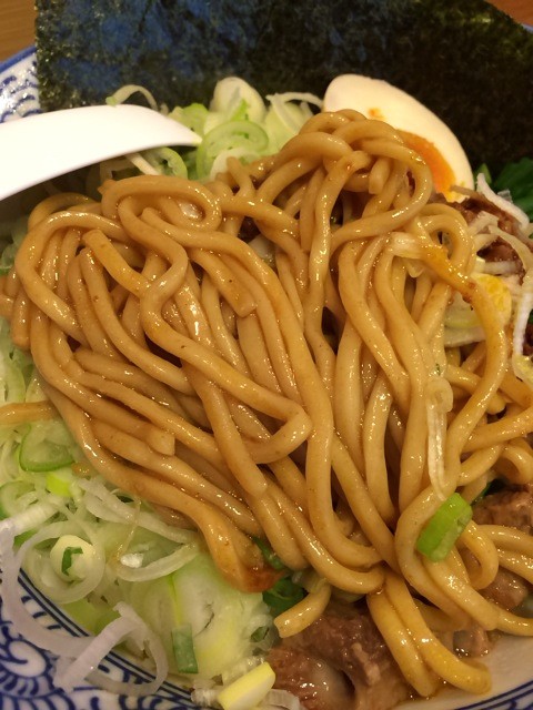 麺はもっちり太麺。カレー風味のピリ辛タレをまぜて。