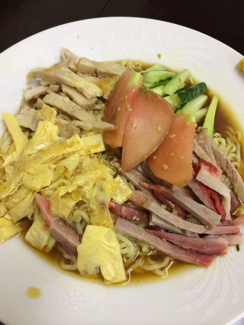 トッピングは中華ハムに蒸し鶏、薄焼き玉子、キュウリ、トマト。