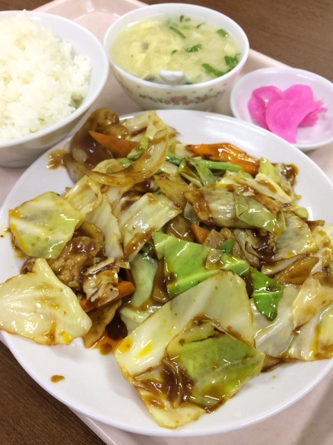 豚肉にキャベツ、玉葱、ピーマン、人参などの炒めもの。