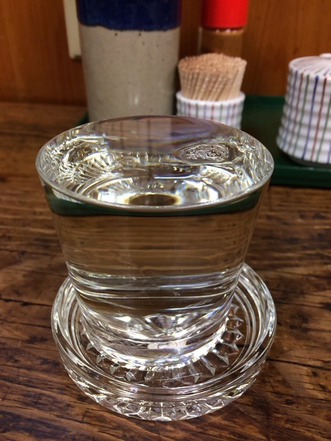 グラスたっぷり、というか、若干こぼれる並々日本酒。