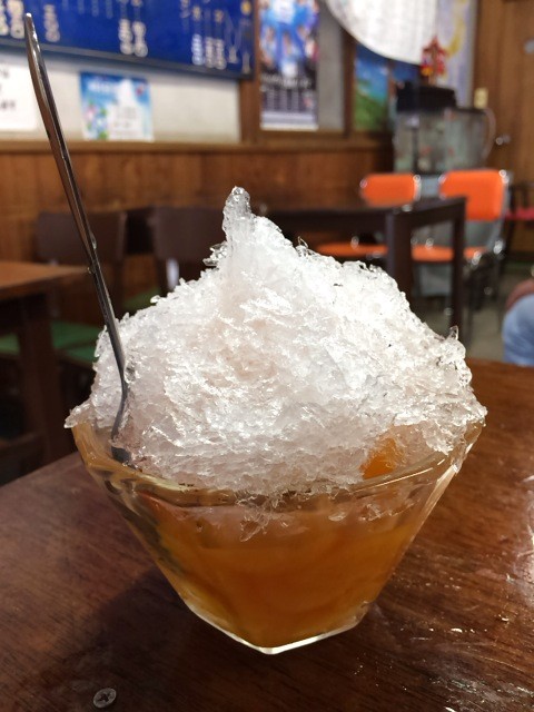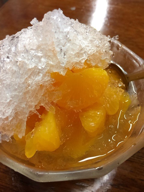 氷を崩しつつ、ミカンの酸味にシロップで。
