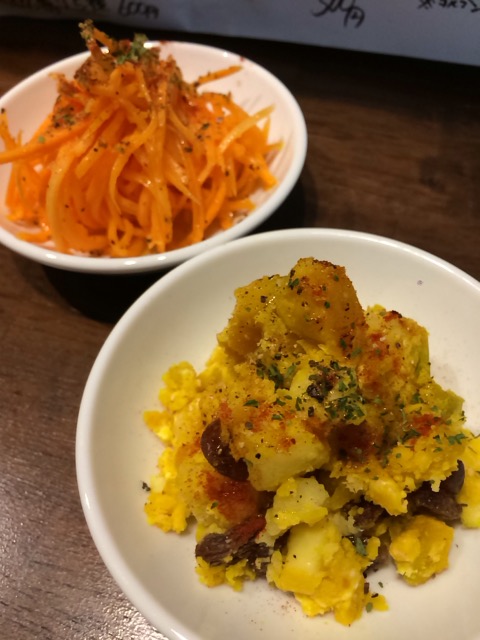 ”カボチャとクリームチーズのサラダ”、”人参マリネ”各200円。
