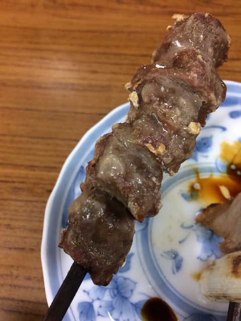 つまみは”とん焼2本、ねぎま、砂肝(各110円)”。
