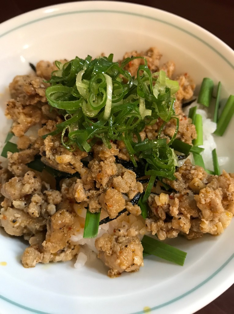 ご飯の上にピリ辛粗挽き挽肉にニラとネギ。