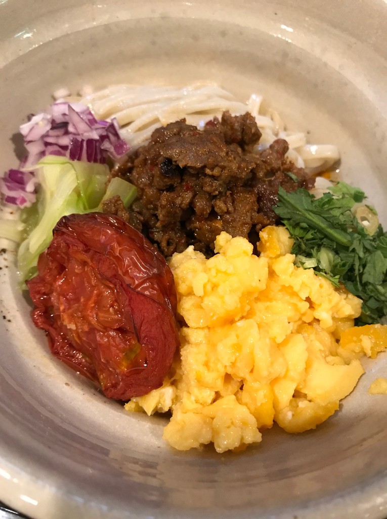もっちり太めの麺に子羊挽肉、炒り卵、