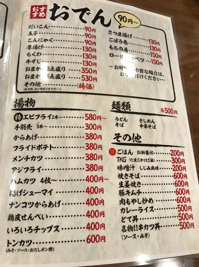 串かつとおでんをメインに揚物、焼物、一品など。