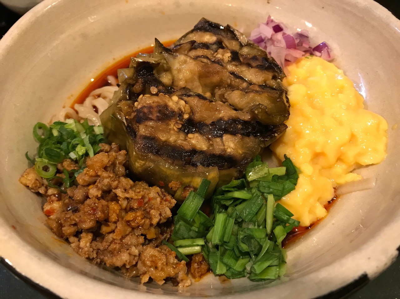 ”とみちゃんの大トロ天狗ナスまぜそば(950円)”。