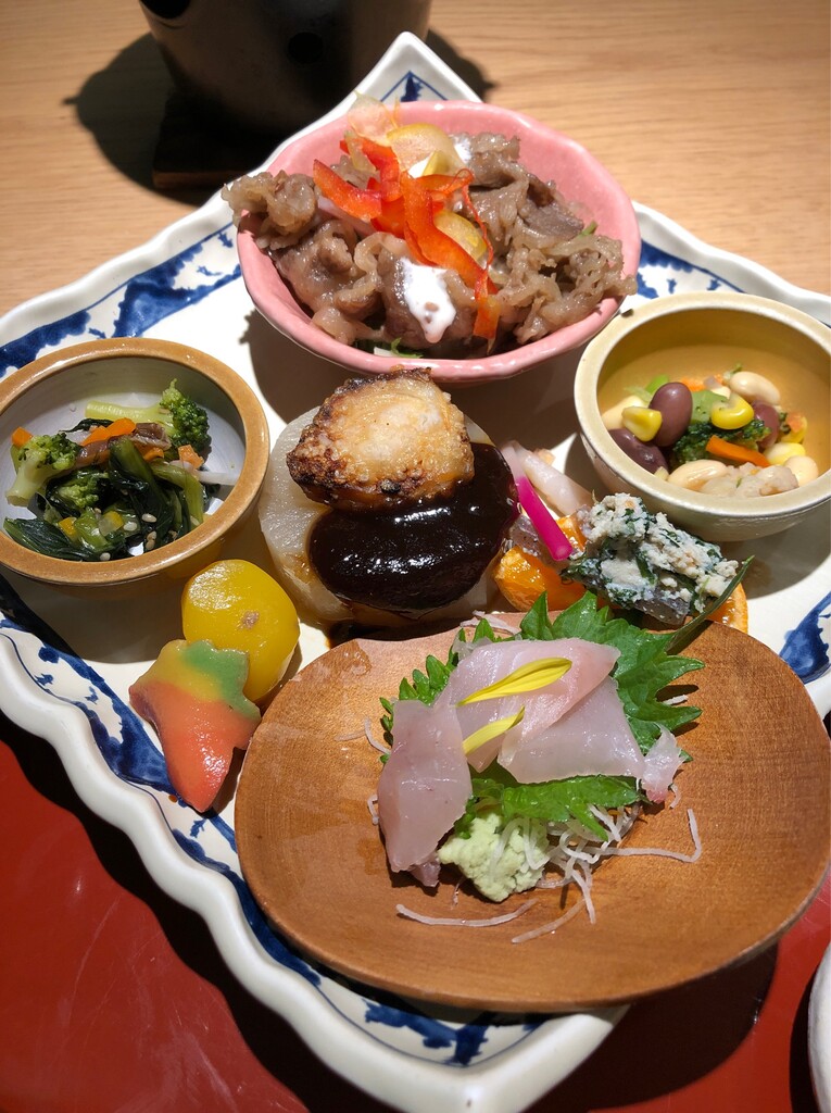 ブリ大根を中心にお刺身、松坂牛のサラダ、お浸しなど。