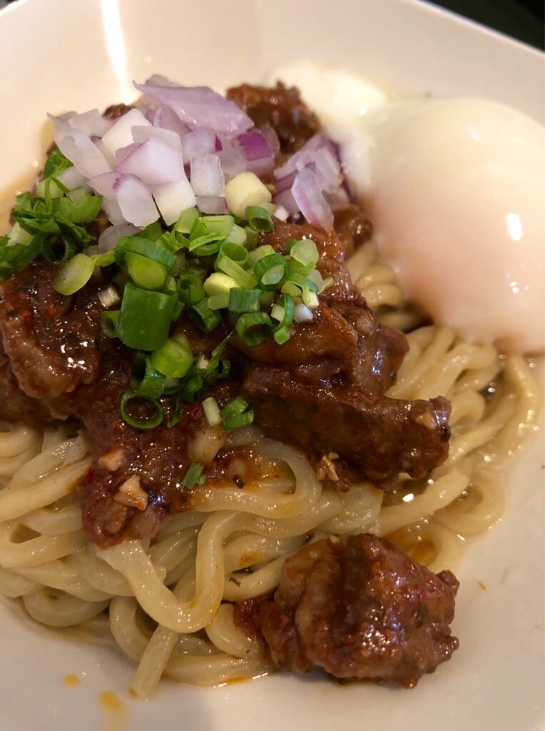 やや太めのもっちり麺に和牛チリトマト煮込みと温玉。