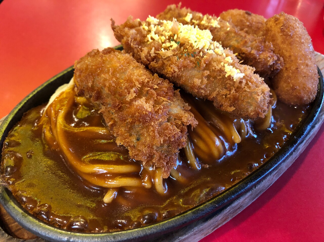 アツアツ鉄板に太めのもっちりパスタとピリ辛あん。