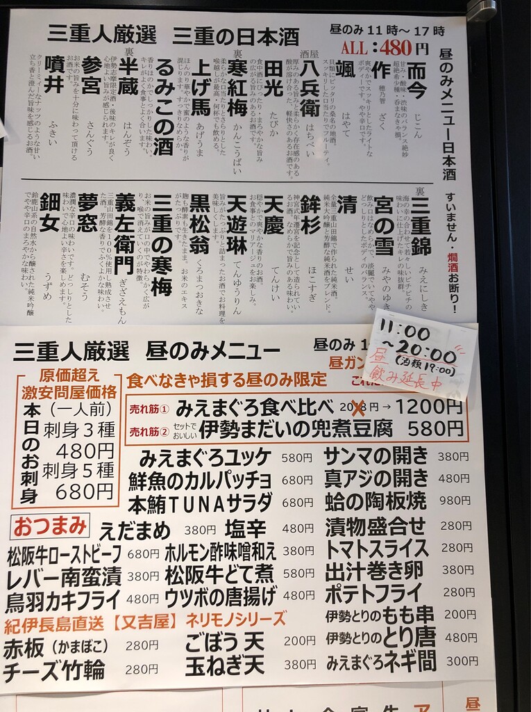 三重の地酒が並んだメニューから。