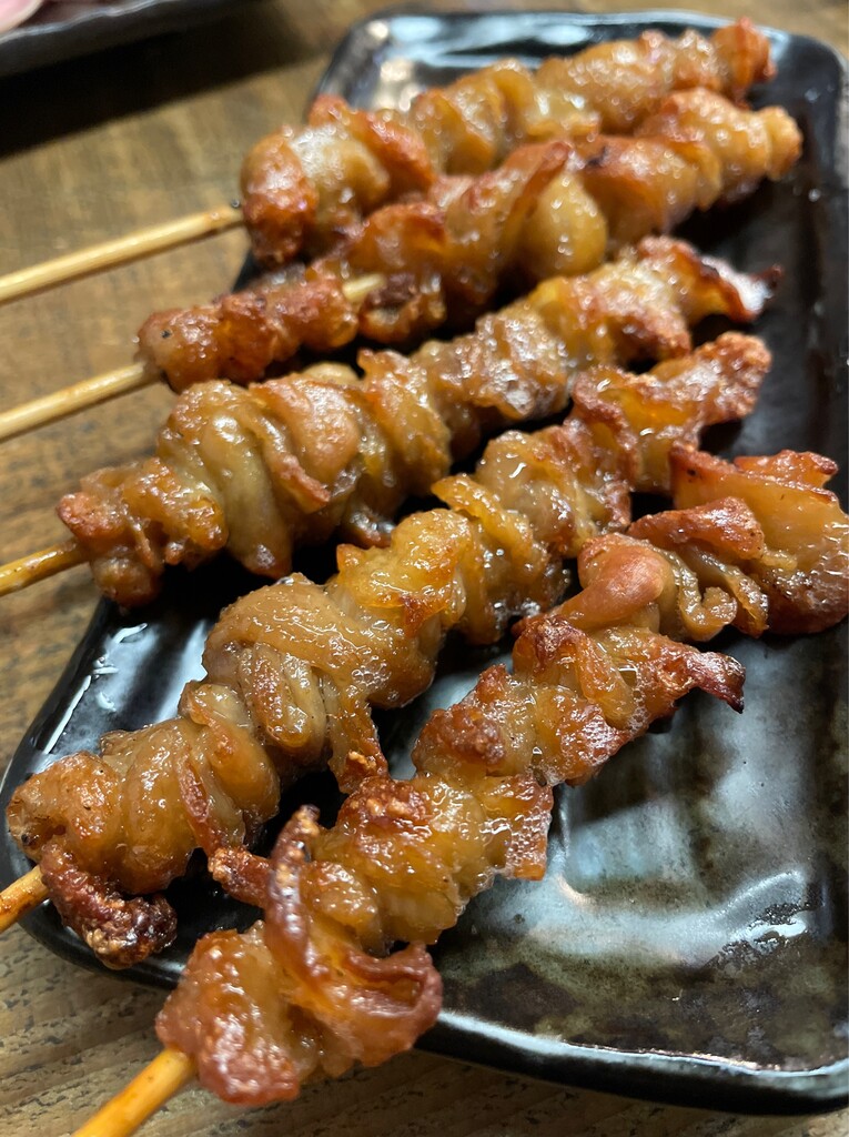 ぐるぐると串に巻かれた鳥皮がカリカリで。