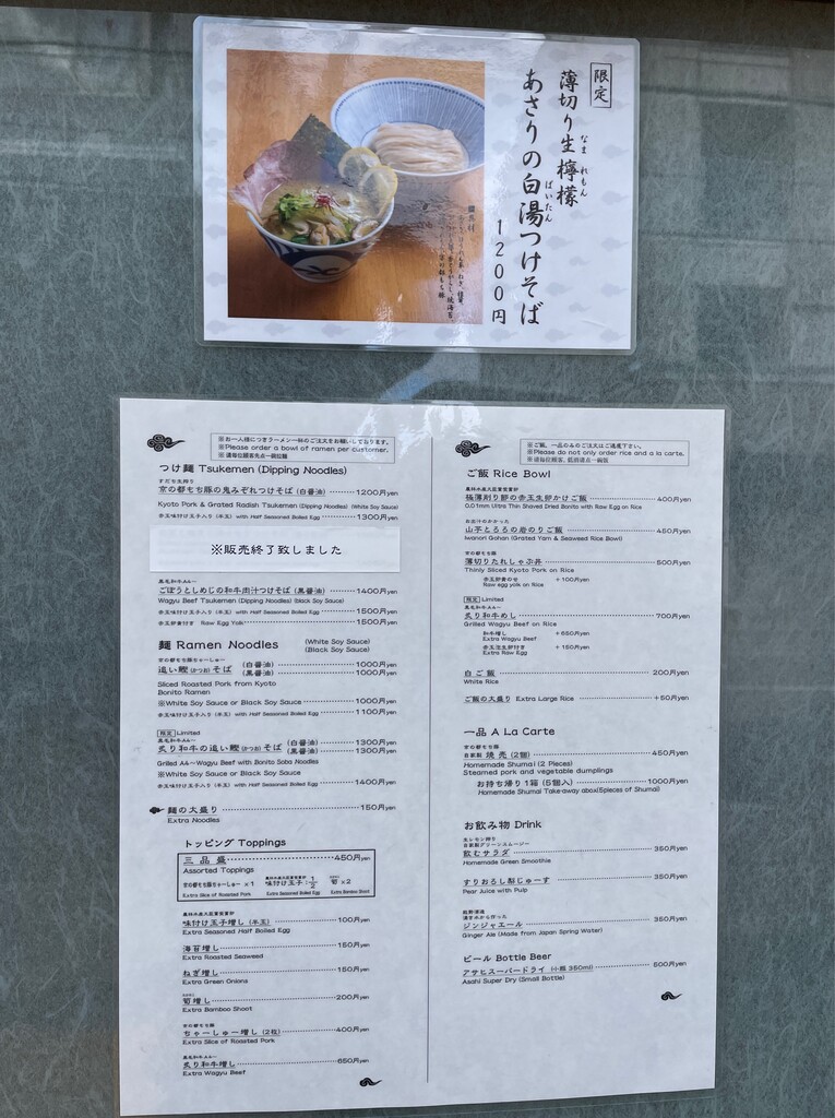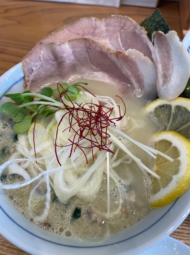 猪一離れ@京都・四条烏丸で、薄切り生檸檬 あさりの白湯つけそば。