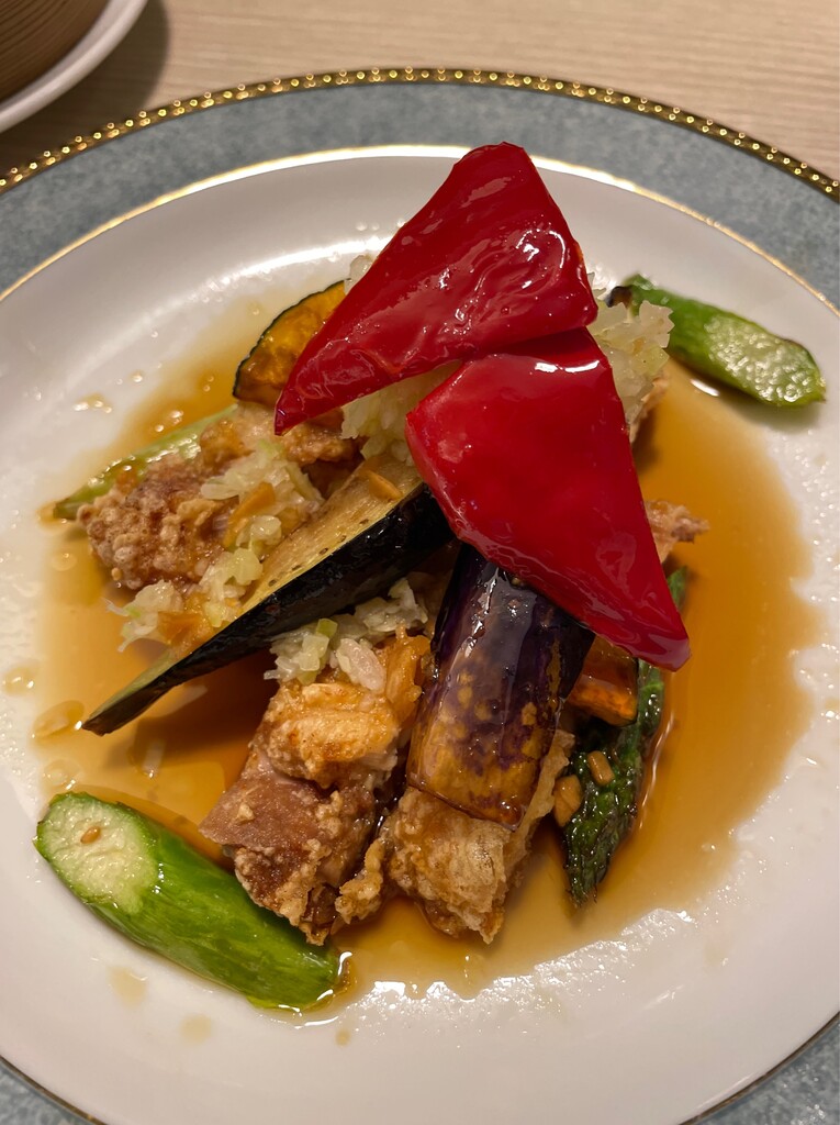 サクッと揚げ鶏に色鮮やかな野菜が。