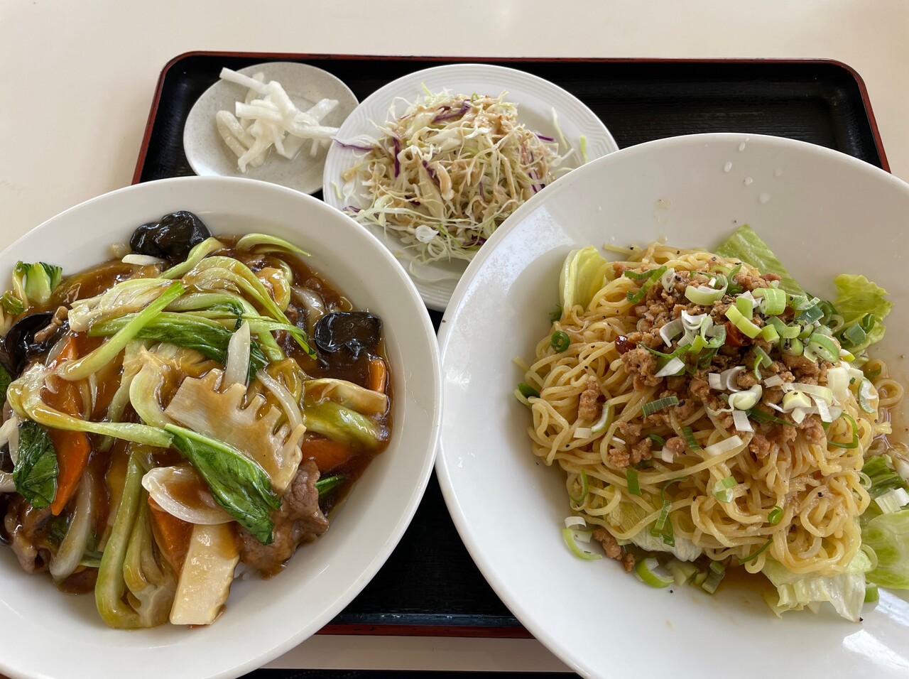 冷やし担々麺に牛肉飯とサラダ、漬物。
