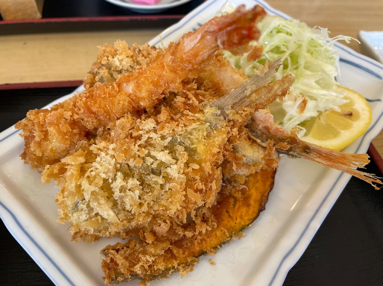 魚2尾にエビとカボチャのフライ。