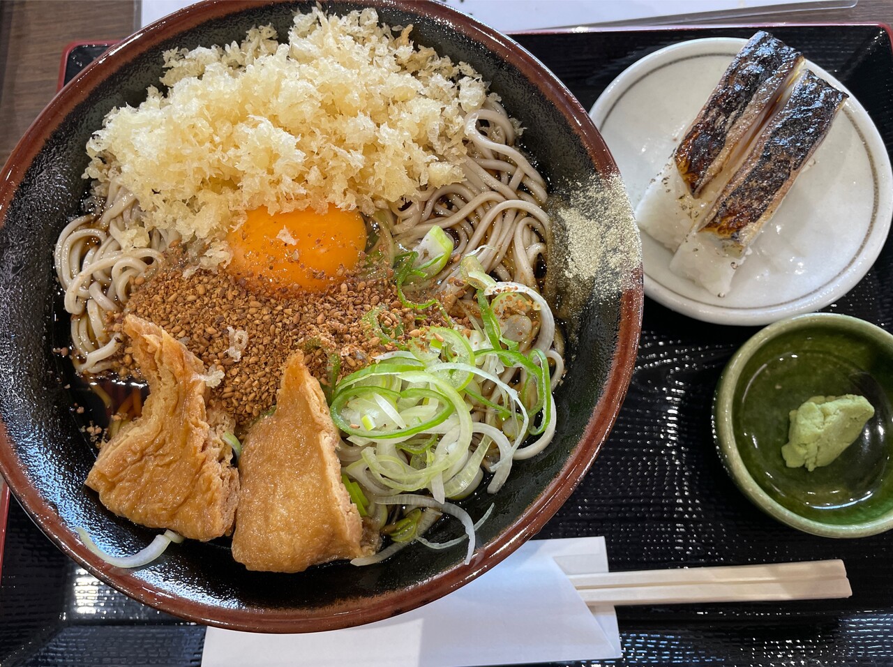”冷したぬきそば さば寿司セット 生たまご入り”。