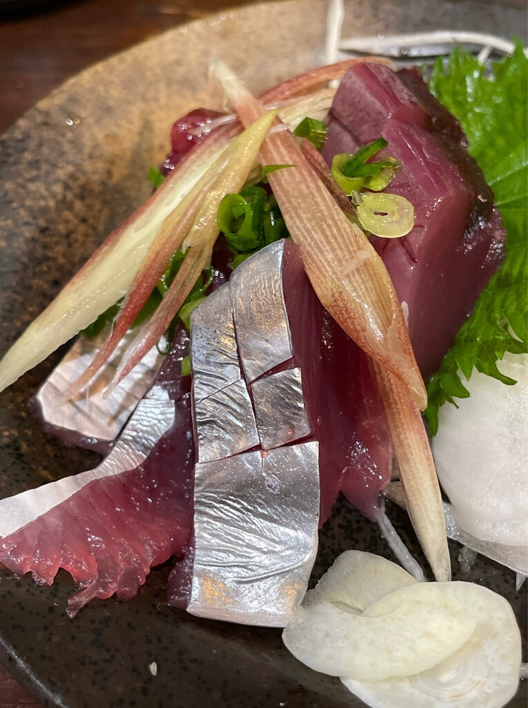 じゃんだら@浜松で、生かつお刺身+緑茶割ほか。